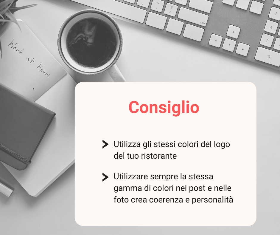 Utilizza il colore del logo del tuo locale o il colore predominate del tuo ristorante all’interno dei tuoi post.